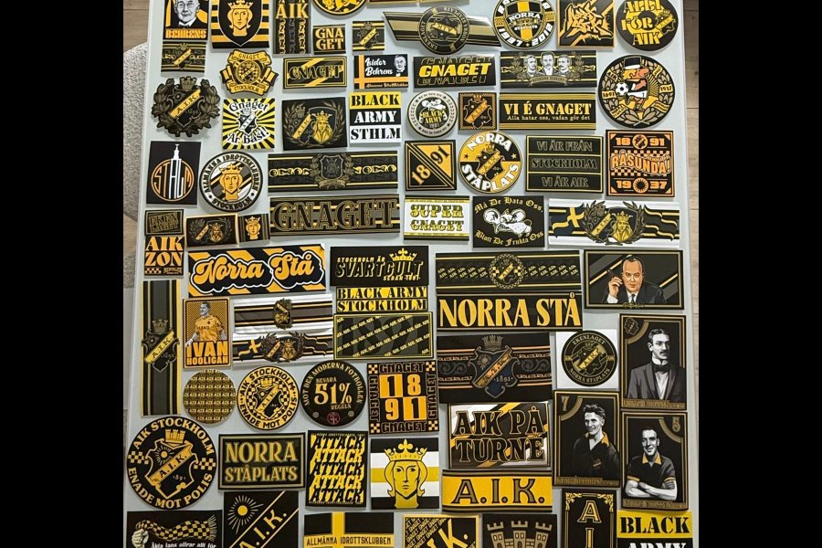 Större samling av 99 stycken AIK klistermärken med olika motiv.