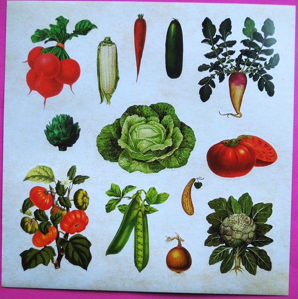 Stickers: Tomater, rädisor, majs, ärtor, kronärtskocka mm. Mått: 15 cm x 17 cm. Mycket fint skick, ny. Samfraktar. Om fler köp kontakta mig för rätt porto.