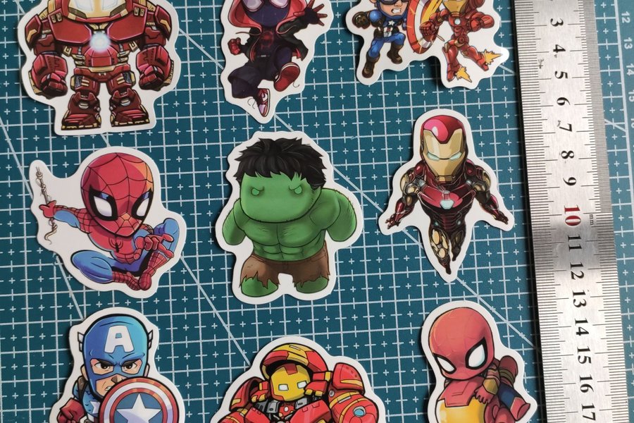 Ett set med klistermärken med motiv från Marvel. Perfekt för att dekorera dina ägodelar med dina favorit superhjältar som Iron Man, Captain America, Spiderman och Hulken.
