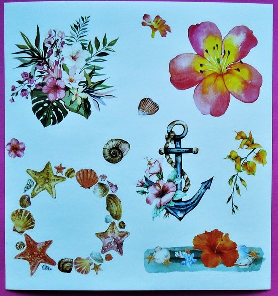 Stickers: Blommor, ett ankare, snäckor, sjöstjärnor. Mått: 14 cm x 17 cm. Mycket fint skick, ny. Samfraktar. Om fler köp kontakta mig för rätt porto.