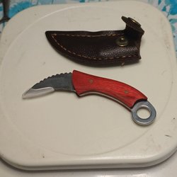 Denna lilla kniv har en unik design med en skarp, vågigt blad och ett handtag i trä. Den levereras med ett läderskydd för säker förvaring. Stl bladets längd 45mm,vikt 12gr.Perfekt för den som söker en praktisk och stilren kniv. Titta gärna på mina andra auktioner. OBS! Jag tar inte ansvar för PostNords slarv.