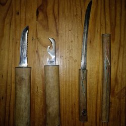 2 knivar i olika stilar. Bladet har synliga tecken på användning. Passar för friluftsliv eller som samlarobjekt.