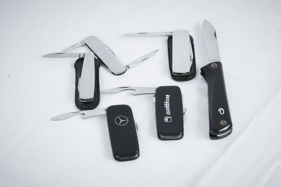 Diverse fickknivar. En med Mercedes-Benz logga, en med Byggelit logga.