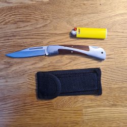 En fällkniv med ett trähandtag och metallkomponenter. Bladet är av rostfritt stål. Passar för användning inom friluftsliv eller som samlarobjekt.