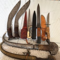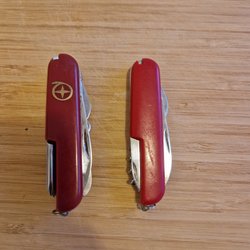 Två knivar, en ganska tung med tjockt blad Olsen instansat vid bladroten, trähandtag. En liten smidig slidkniv med laminerat blad, Frosts fabrikat, trähandtag, slidan i läder. En liten, nästan osynlig spricka i den bakre mässingshylsan på handtaget. Avhämtning och samfrakt är möjligt.