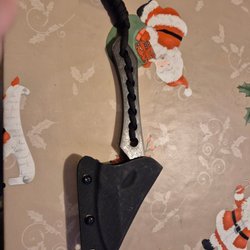 Kniv från Dragon Dragon Creek. Kniven har ett svart handtag med textur och ett svart blad. En svart slida medföljer. Kniven är 285mm lång bladet är 166mm tjocklek blad är 5.6mm väger 318gram. Det är en tung och gedigen kniv fodralet går att ändra om man vill ha det vågrätt.