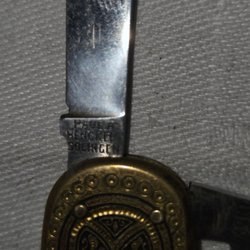 Fällkniv med svart handtag och guldfärgade detaljer. Bladet är i rostfritt stål.
