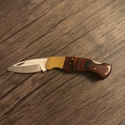 Fällkniv med ett handtag i trä och metall. Kniven har en klassisk design.Buck 501 USA.