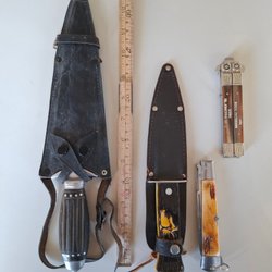 Tre knivar, varav en med läderslida. En av knivarna har ett rött handtag och en annan har ett handtag i trä. Den tredje kniven har ett plast handtag.