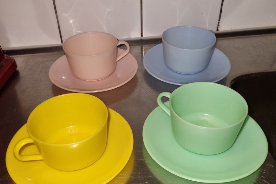 Färgglada koppar med tillhörande fat.