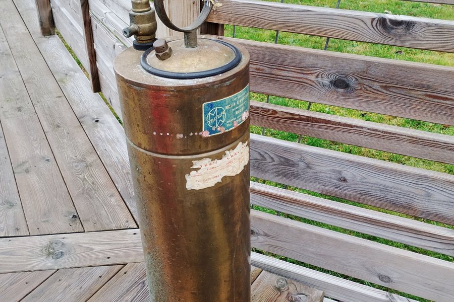 En äldre brandsläckare. Etiketter från Melin & Westberg Ingeniörsfirma Malmö samt Oven Carlsson Fridhemsgatan 11 finns kvar.