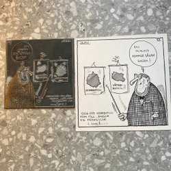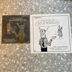 Kliché och teckning föreställande Mars som beställer kaffe från Pressbyrån. Enligt teckningen har ett flygande tefat setts i Svappavaara.