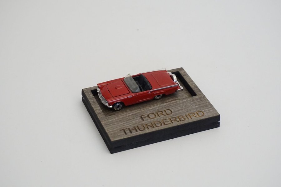 En röd Ford Thunderbird modellbil, placerad på ett trästativ med texten "FORD THUNDERBIRD" ingraverad. Corgi