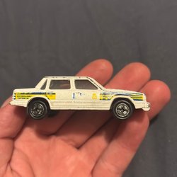 En leksaksbil av märket Corgi Cubs. Bilen är vit och röd med röd inredning. Hjulen rullar men kanske något hjul rullar lite trögt