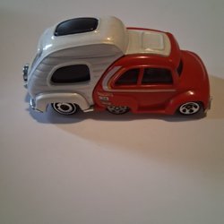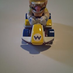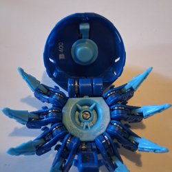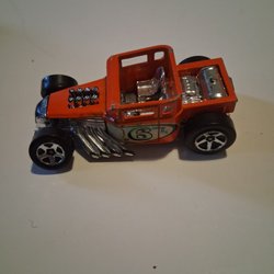 Denna leksakshelikopter har en svart kropp med orange rotorblad och landningsställ. Helikoptern har en Batman-logotyp på sidan.