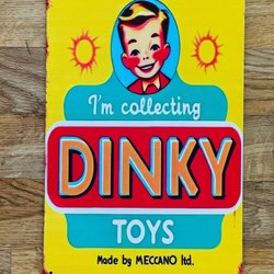 Dekorativ plåtskylt med motiv från Dinky Toys. Perfekt för samlaren eller som en nostalgisk detalj i hemmet.