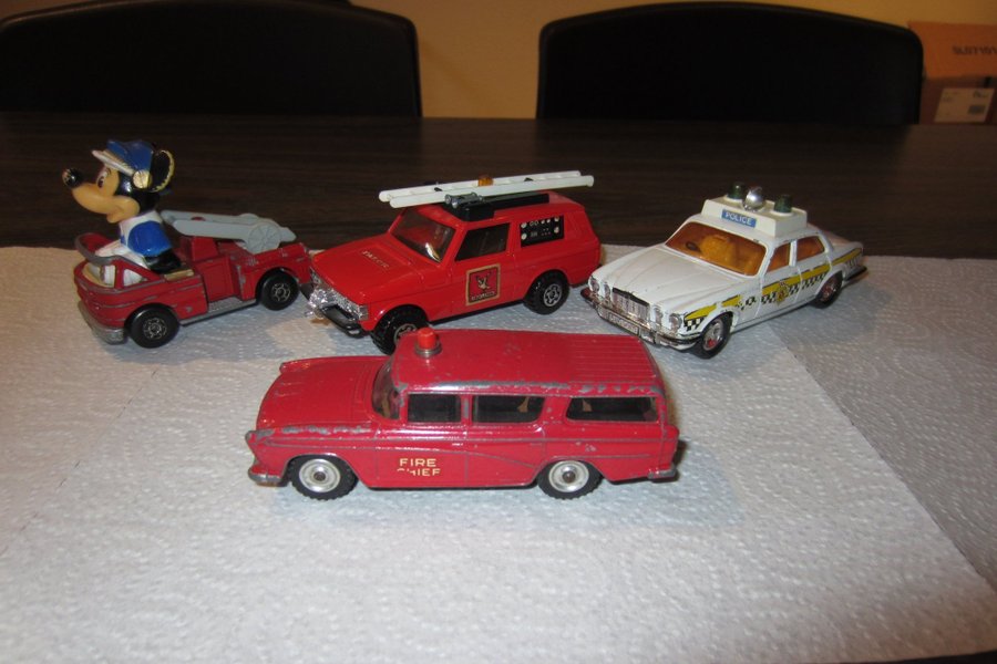 Dette er et sæt med 4 Dinky Modelbiler. Sættet inkluderer en rød brandbil med Mickey Mouse, en rød Falck bil, en hvid politibil og en rød "Fire Chief" bil.
