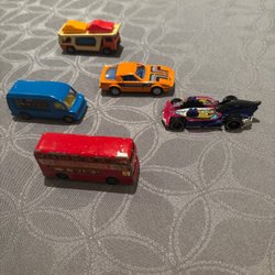 Ett set med fem Matchbox leksaksbilar. Inkluderar olika modeller och färger.