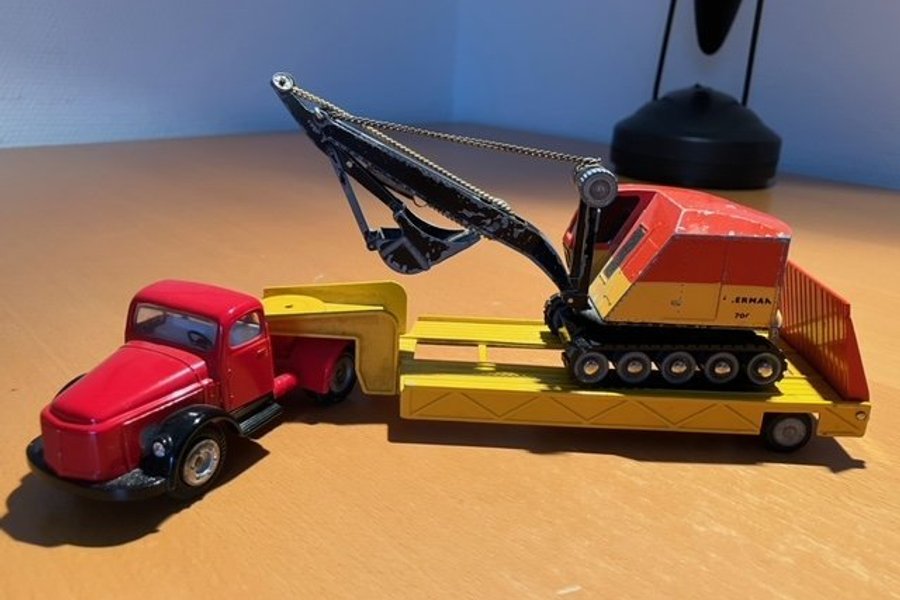 En Tekno Volvo Transport med Åkerman Grävmaskin, Bilen och släpet är i väldigt fint skick, medans grävskopan är i lekt skick, fattas ett stag vid skopan, men det finns här på tradera att köpa ny skopa (75:-) ifall köparn vill det, Modellen är i lekt skick. har haft dessa i 10år Se bilder för egen bedömning.
