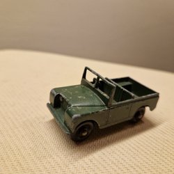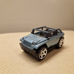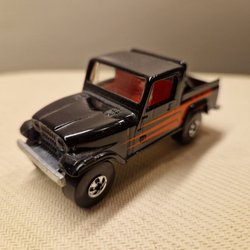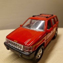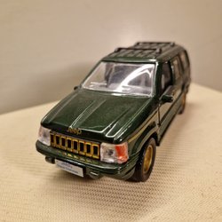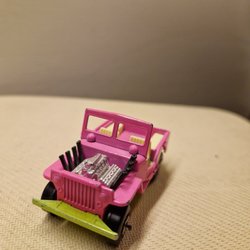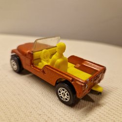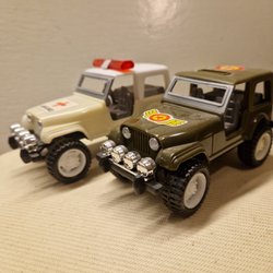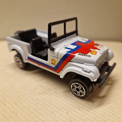 En modellbil Jeep CJ7, dekorerad med Kleber Racing Cross Elf-tema. Tillverkad av Majorette Frankrike skala 1/32. Motorhuven kan öppnas för att visa motorn.