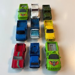 Ett varierat set med leksaksbilar och lastbilar. Inkluderar olika modeller och märken, perfekta för samlare eller barn.