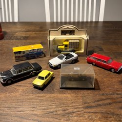 Samling av leksaksbilar i metall och plast. Inkluderar olika modeller och märken.