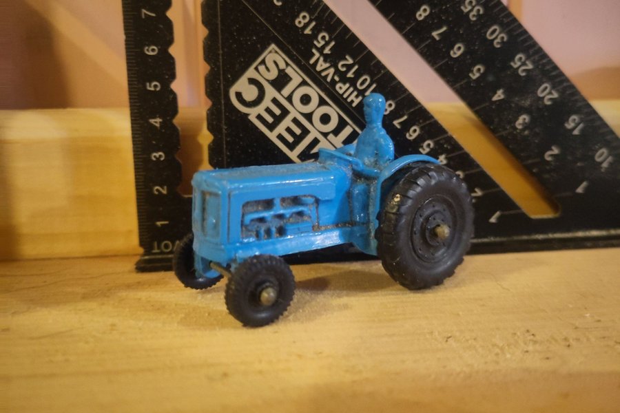 Blå leksakstraktor i metall med förare. Perfekt för samlare eller barn.