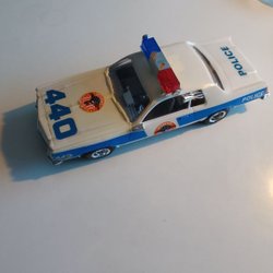 En leksaksbil i form av en polisbil. Bilen är svart med texten "POLICE" på sidan och har en blå och röd ljusramp på taket. Den har även nummer 1035 tryckt på taket och 112 på bakluckan. Maisto småbilsskala