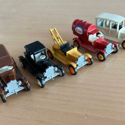 Två T-Fordar från Matchbox, en med dåligt bakhjul.