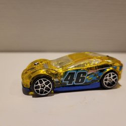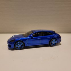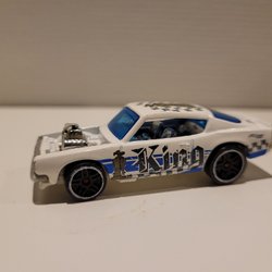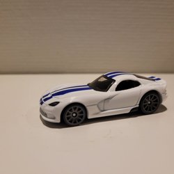 En leksaksbil av modellen Jaguar E-Type Lightweight. Bilen är blå med vita detaljer och nummer 65 tryckt på motorhuven. På registreringsskylten står det MBX 1961. Matchbox småbilsskala