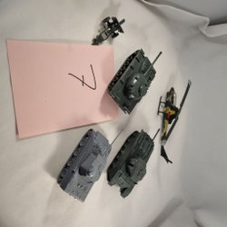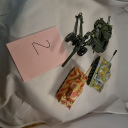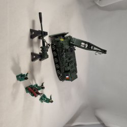 Ett set med två leksaksstridsvagnar en motorcykeln med band och en släpkärra för ammonution.