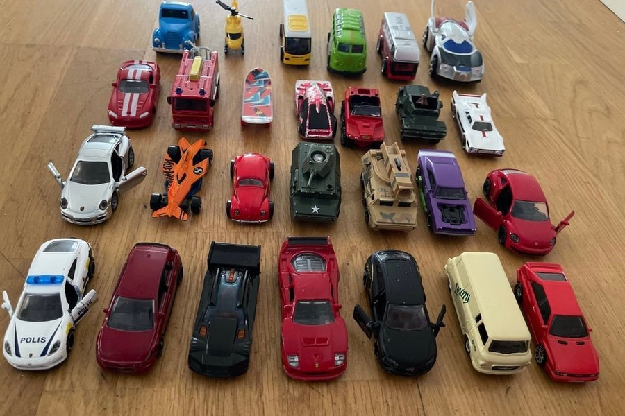 Hot Wheels, Majorette.. leksaksbilar och fordon av olika modeller och färger. Bland fordonen finns personbilar, polisbilar, lastbilar, en brandbil, en skateboard, en helikopter och militärfordon. Några med dörrar som öppnas eller pullback kör själva.. de flesta mkt bra skick