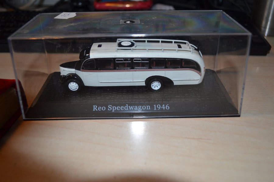 Modellbuss av en Reo Speedwagon från 1946. Bussen är vit och svart med röda detaljer och har ett takräcke. Den står på en svart bas med texten "Reo Speedwagon 1946" och är innesluten i en genomskinlig monter. Lycka till med budgivningen. Vet inte skalan tyvärr.