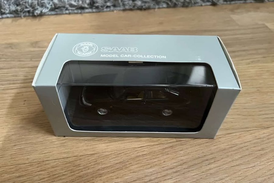 Saab modellbil från Saab Model Car Collection. Bilen är svart och kommer i en förpackning med genomskinligt fönster.