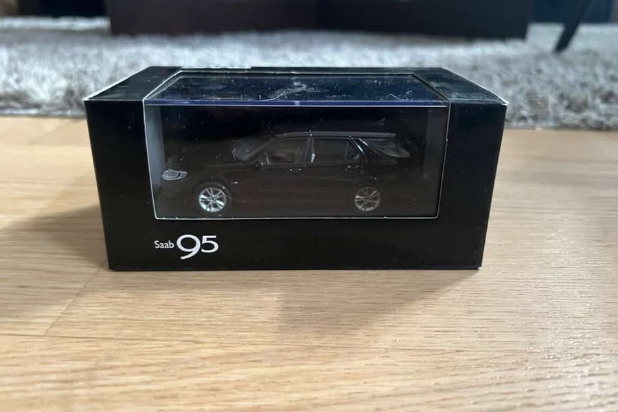 Modellbil av en Saab 9-5 i skala 1:43. Bilen är svart och kommer i en svart förpackning med texten "Saab 95" på framsidan.