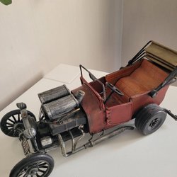 Detta är en metallbilmodell. Den är tillverkad av metall och har en detaljerad design som liknar en äldre bilmodell. Bilen har fyra hjul och en öppen kaross.