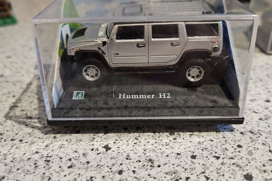Modellbil av en Hummer H2 i en displaybox. 1/72