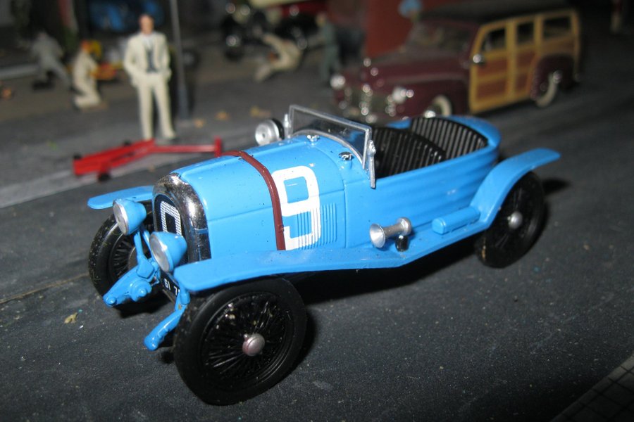 Modelbil af en Bugatti Type 35 i blå med nummer 9 på siden. Bilen har detaljerede hjul og forlygter.1-43