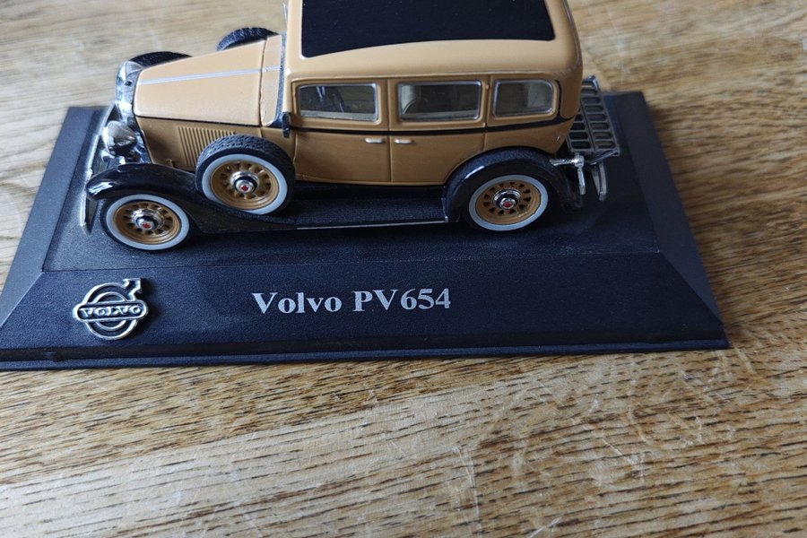 Modellbil av en Volvo PV654 i skala 1:43. Bilen är beige och svart med vita däcksidor. Den står på en svart bas med texten "Volvo PV654" och Volvo-logotypen.
