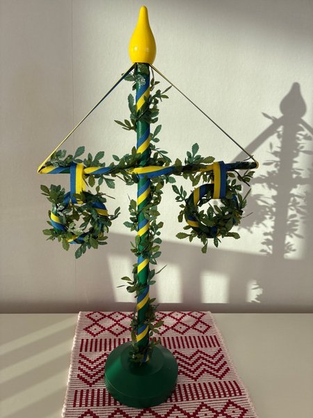 Dekorativ majstång med löv och blågula band. Perfekt för midsommarfirandet. Dimension cirka 39x21 cm. Djur- och rökfritt hem.