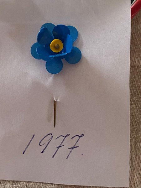 Majblomma från år 1977 som inte har använts utan varit placerad på en märkessköld.