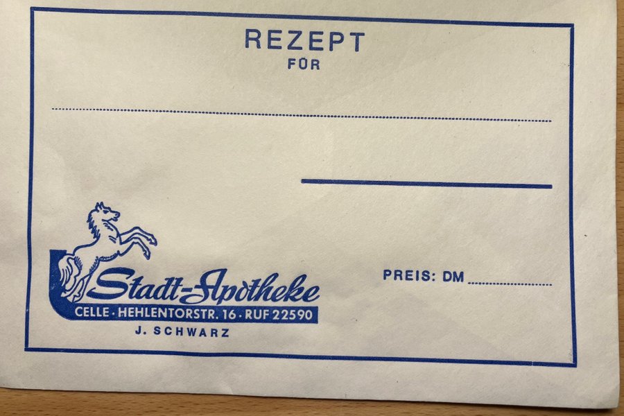 Ældre Receptkuvert fra Stadt-Apotheke i Celle, Hehlentorstr. 16. RUF 22590. J. Schwarz.