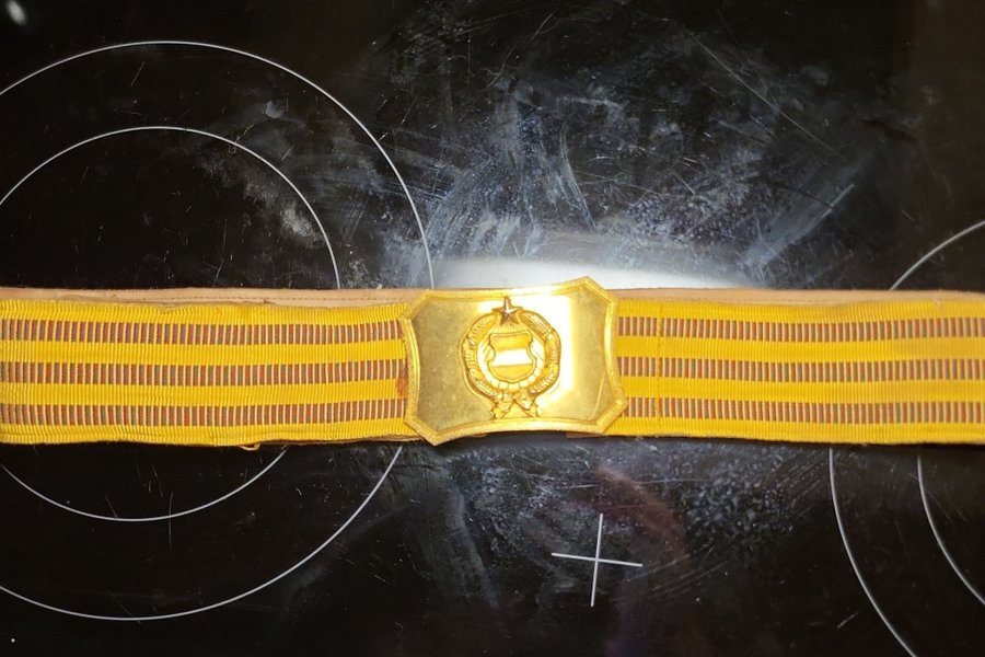 Ett gult bälte med ett spänne i mitten. Bältet har ränder i en annan färg.
