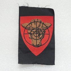 Ett grönt tygmärke med ett motiv av en bevingad hjälm i svart. Märket är format som en sköld.