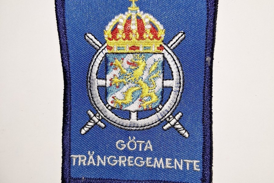 En broderad tygmärke som representerar Göta trängregemente. Märket har en blå bakgrund med en vapensköld i mitten, krönt av en kunglig krona. Vapenskölden visar ett lejon och omges av ett ankare och två korslagda svärd. Texten "GÖTA TRÄNGREGEMENTE" är broderad nedanför vapenskölden.