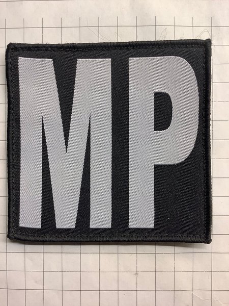 Ett svart tygmärke med vita bokstäver "MP". Märket har en sydd kant. Med kardborre.