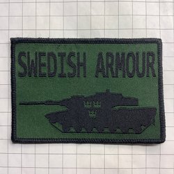 Grön tygmärke med texten "SKARPSKYTT" och ett motiv av ett gevär omgiven av en lagerkrans.