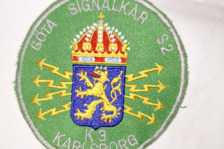 Broderad tygmärke med motiv från Göta Signalkår S2 K3 Karlsborg. Märket är runt med en grön bakgrund och har en vapensköld med ett lejon och en krona i mitten. Runt vapenskölden finns stiliserade blixtar.