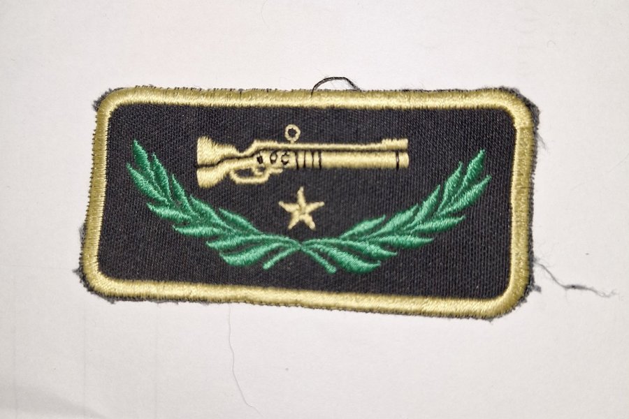 Ett märke med en avbildning av ett gevär och en lagerkrans. Passar för samlare eller som dekoration.
