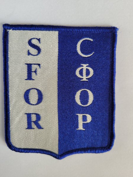 En broderad patch med texten 'SFOR' på en vit bakgrund och 'CFOP' på en blå bakgrund. Patchen har en blå kant och en sköldform.